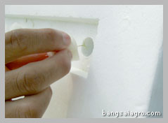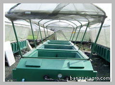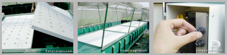 | 1. | เตรียมแปลงปลูกให้พร้อม ให้ตั้งอยู่กลางแจ้งที่มีแดด (แปลงปลูกเป็นระบบสำเร็จรูป สามารถถอดประกอบและเคลื่อนย้ายได้ง่าย) | 2. | เติมน้ำสะอาดในถังพักน้ำ ตรวจเช็คปั๊มน้ำ หัวพ่นน้ำ และวางแผ่นปลูกชนิด 50 ช่อง เพื่อเตรียมปลูก |